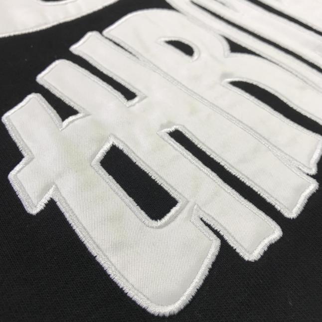 Fabric appliqué embroidery combines patches and embroidery to create a beautifully layered and textured effect. Laser-cut three-dimensional patterns are stitched onto clothing, resulting in a seamless embroidered surface. It can be applied to small areas of T-shirts, polo shirts, or hoodies.